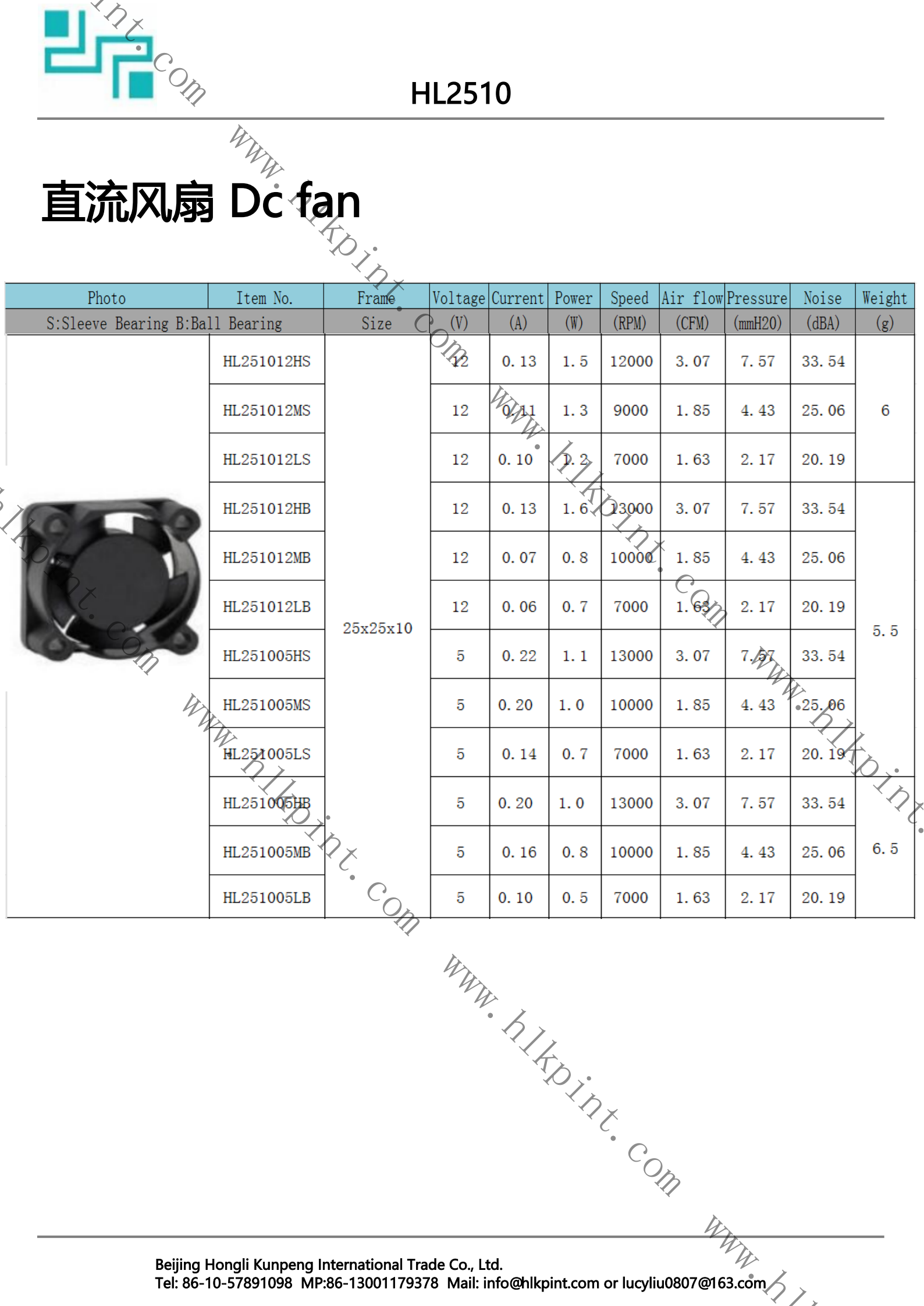HL251012LS HL251012LS Dc fan 25X25X10 12 0.10 1.2 7000 1.63 2.17 20.19 6