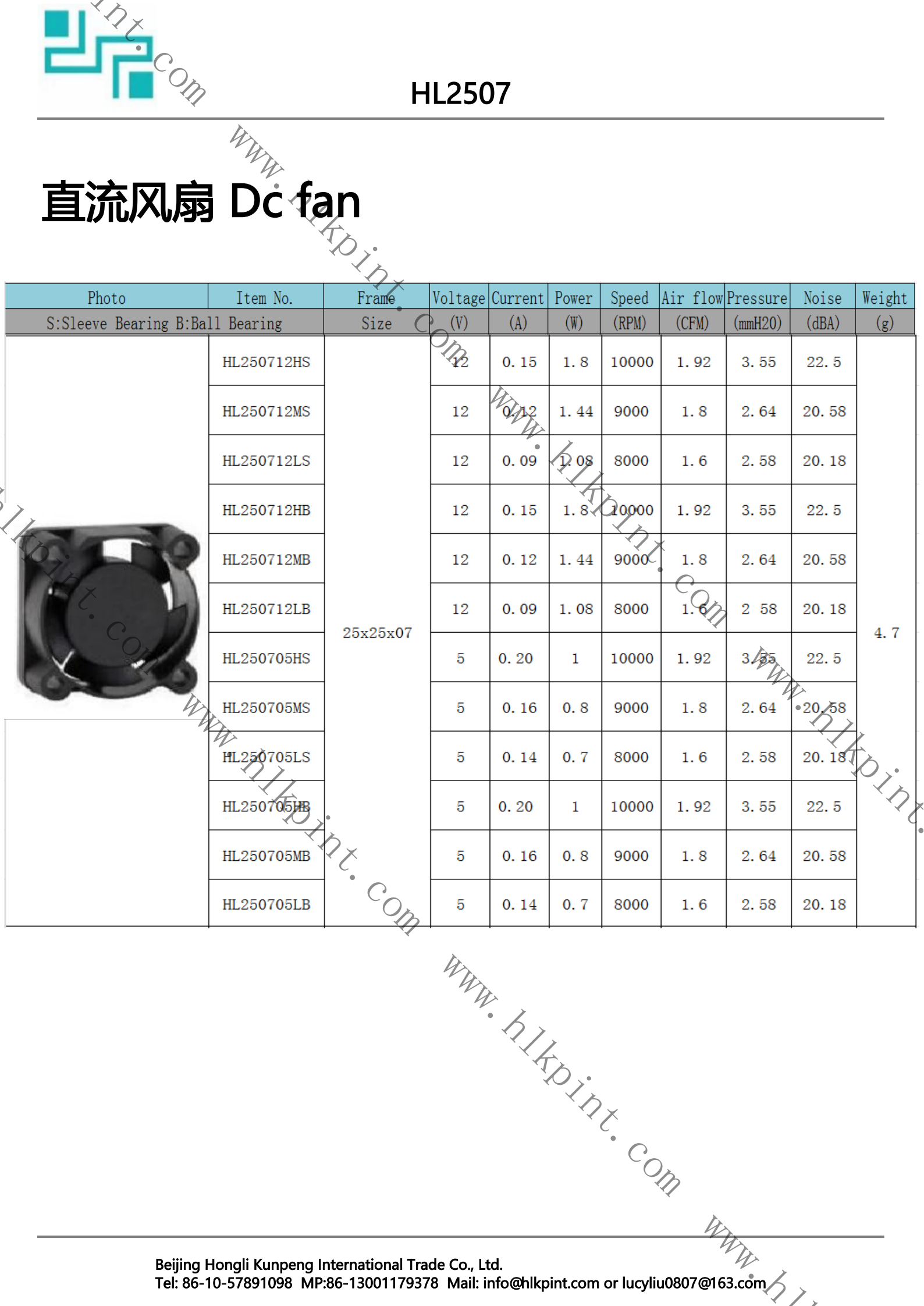 HL250705LB HL250705LB Dc fan 25X25X07 5 0.14 0.7 8000 1.6 2.58 20.18 4.7