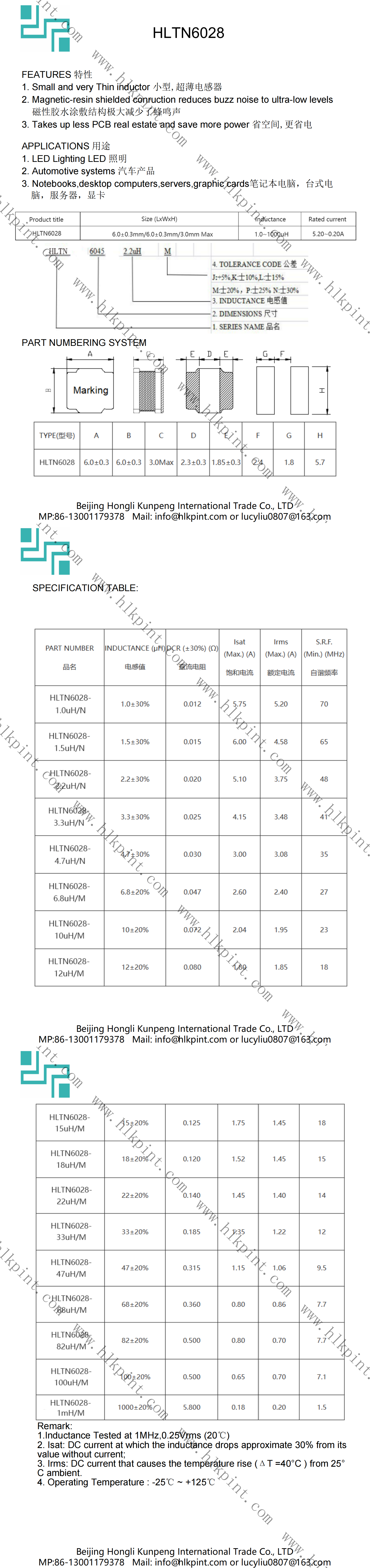 HLTN6028-33uH/M HLTN6028-33uH/M HL6028 6.0±0.3mm/6.0±0.3mm/3.0mm Max(LxWxH)