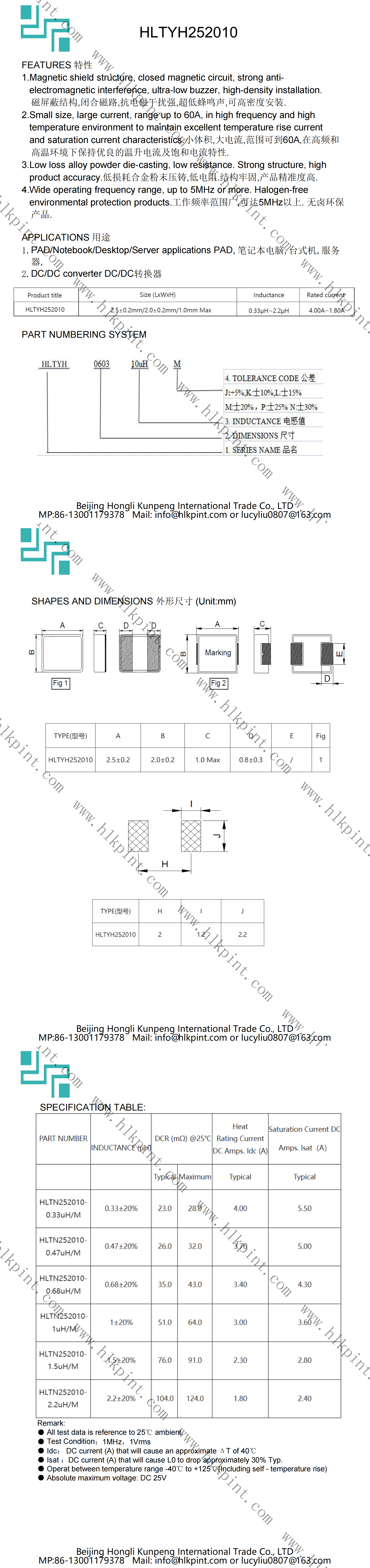 HLTYH252010-1uH/M HL252010 1±20% 2.5±0.2mm/2.0±0.2mm/1.0mm Max(LxWxH)