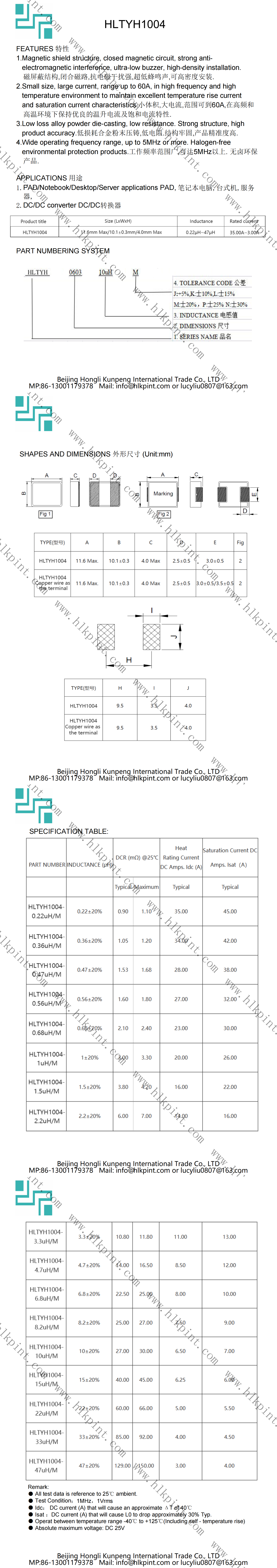 HLTYH1004-22uH/M HL1004 22±20% 11.6mm Max/10.1±0.3mm/4.0mm Max(LxWxH)