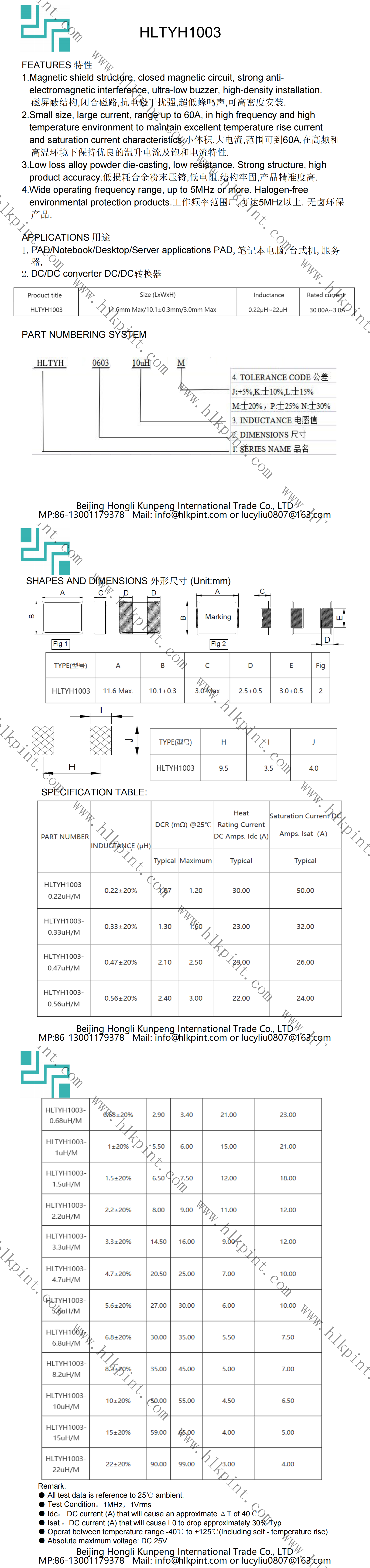 HLTYH1003-22uH/M HL1003 22±20% 11.6mm Max/10.1±0.3mm/3.0mm Max(LxWxH)
