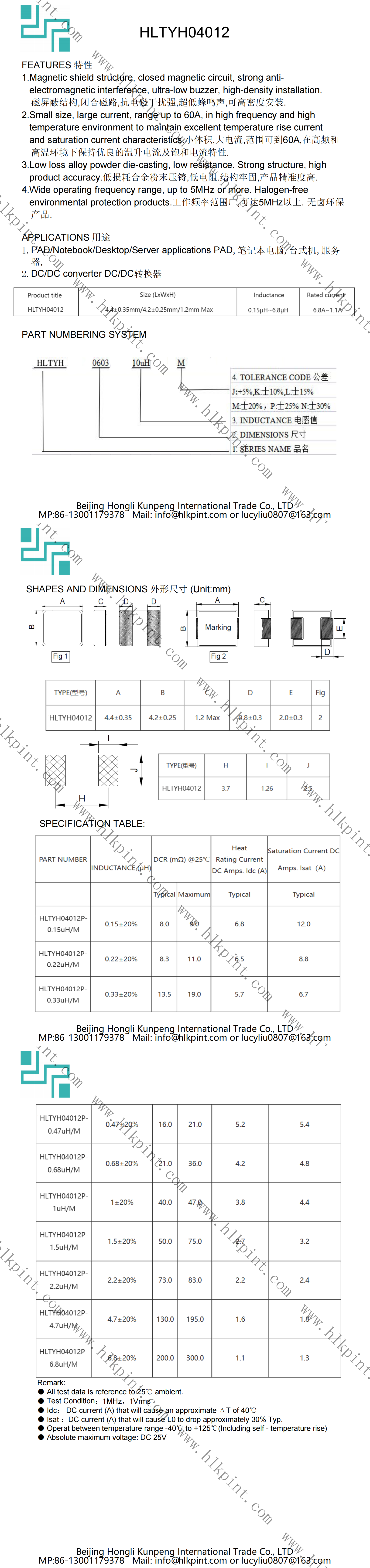HLTYH04012P-1uH/M HL04012 1±20% 4.4±0.35mm/4.2±0.25mm/1.2mm Max(LxWxH)