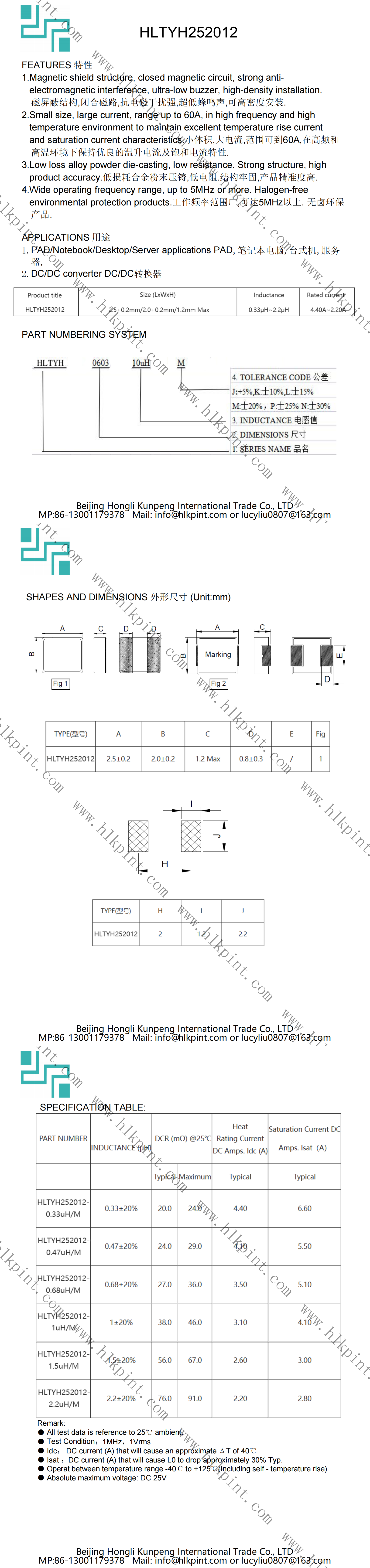 HLTYH252010-2.2uH/M HLTYH252010-2.2uH/M HL252010 2.5±0.2mm/2.0±0.2mm/1.0mm Max(LxWxH)