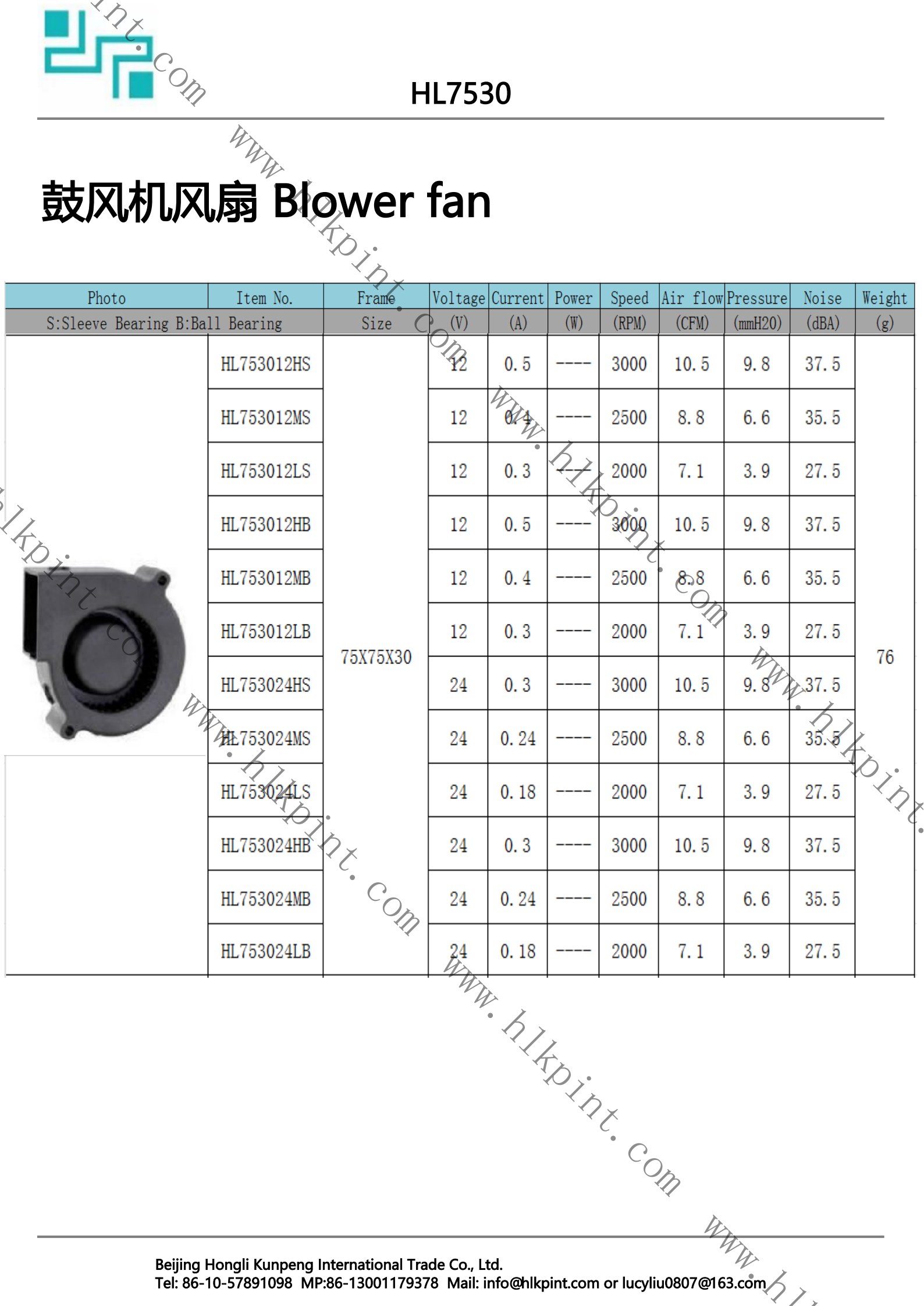 HL753012HB HL753012HB Blower Fan 75X75X30 12 0.5 3000 10.5 9.8 37.5 76