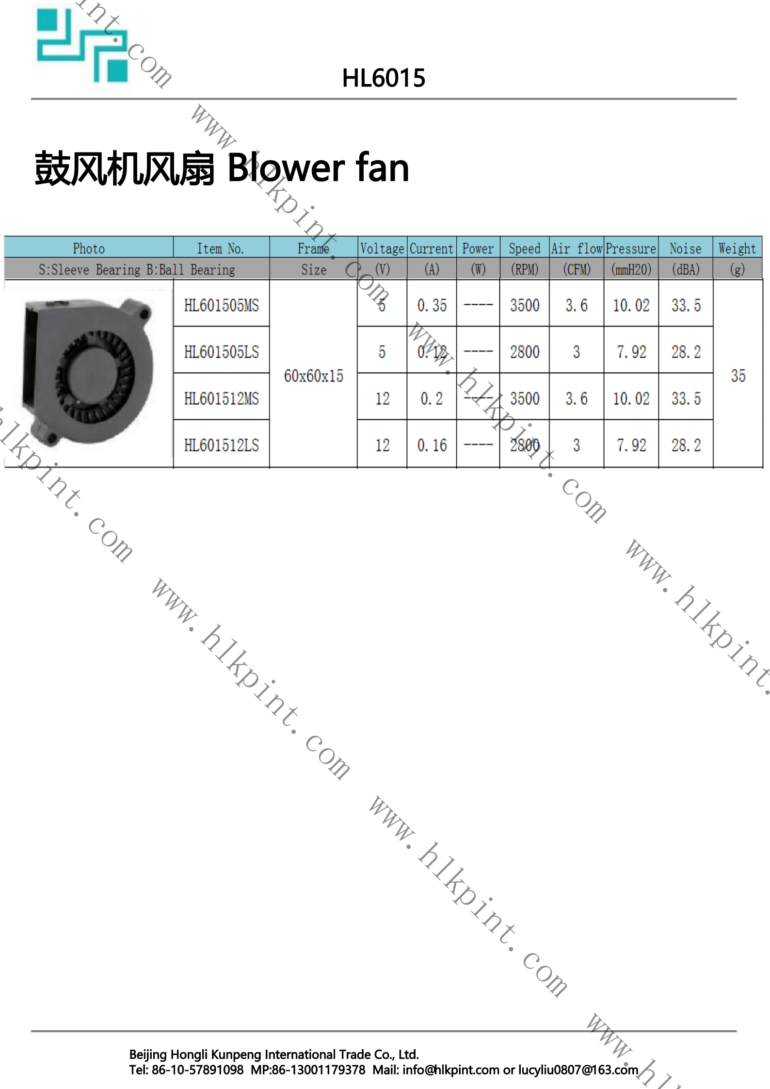 HL601505MS HL601505MS Blower Fan 60X60X15 5 0.35 3500 3.6 10.02 33.5 35