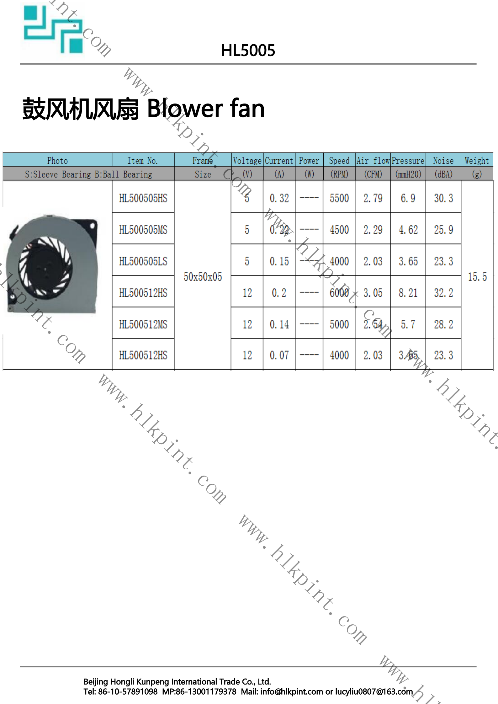 HL500505LS HL500505LS Blower Fan 50X50X05 5 0.15 4000 2.03 3.65 23.3 15.5