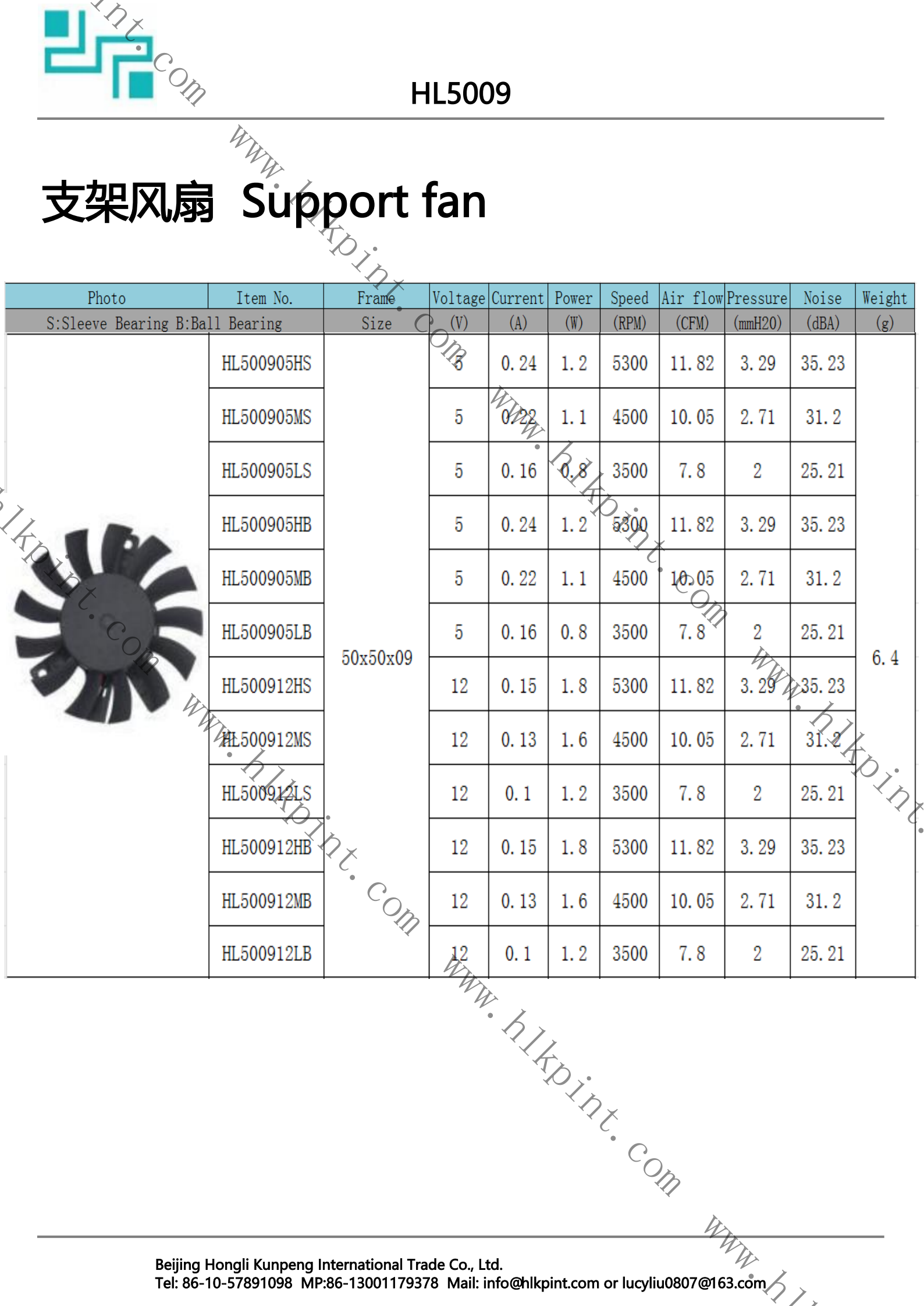 HL500905LB HL500905LB Support Fan 50X50X09 5 0.16 0.8 3500 7.8 2 25.21 6.4