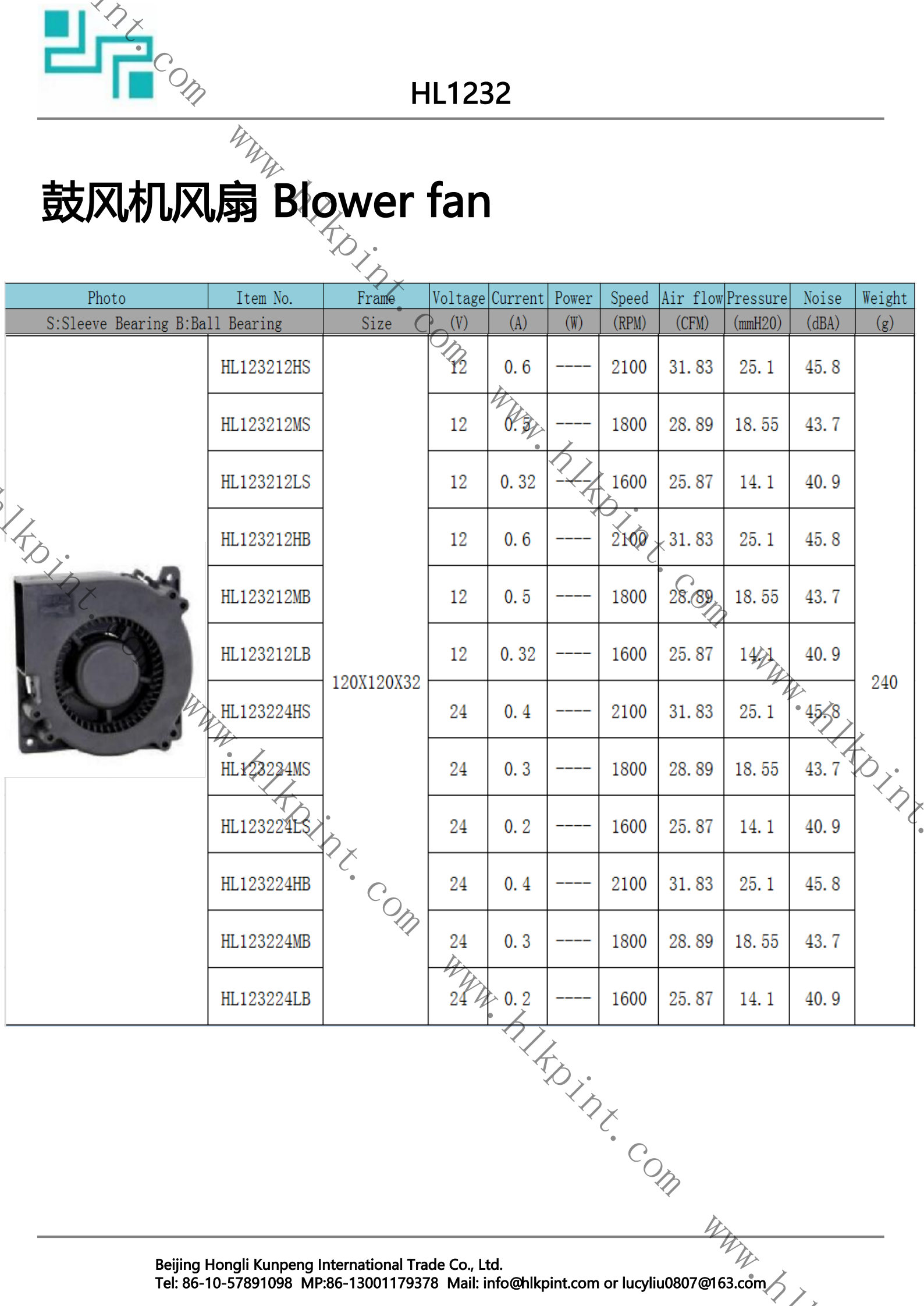 HL123212LB HL123212LB Blower Fan 120X120X32 12 0.32 1600 25.87 14.1 40.9 240