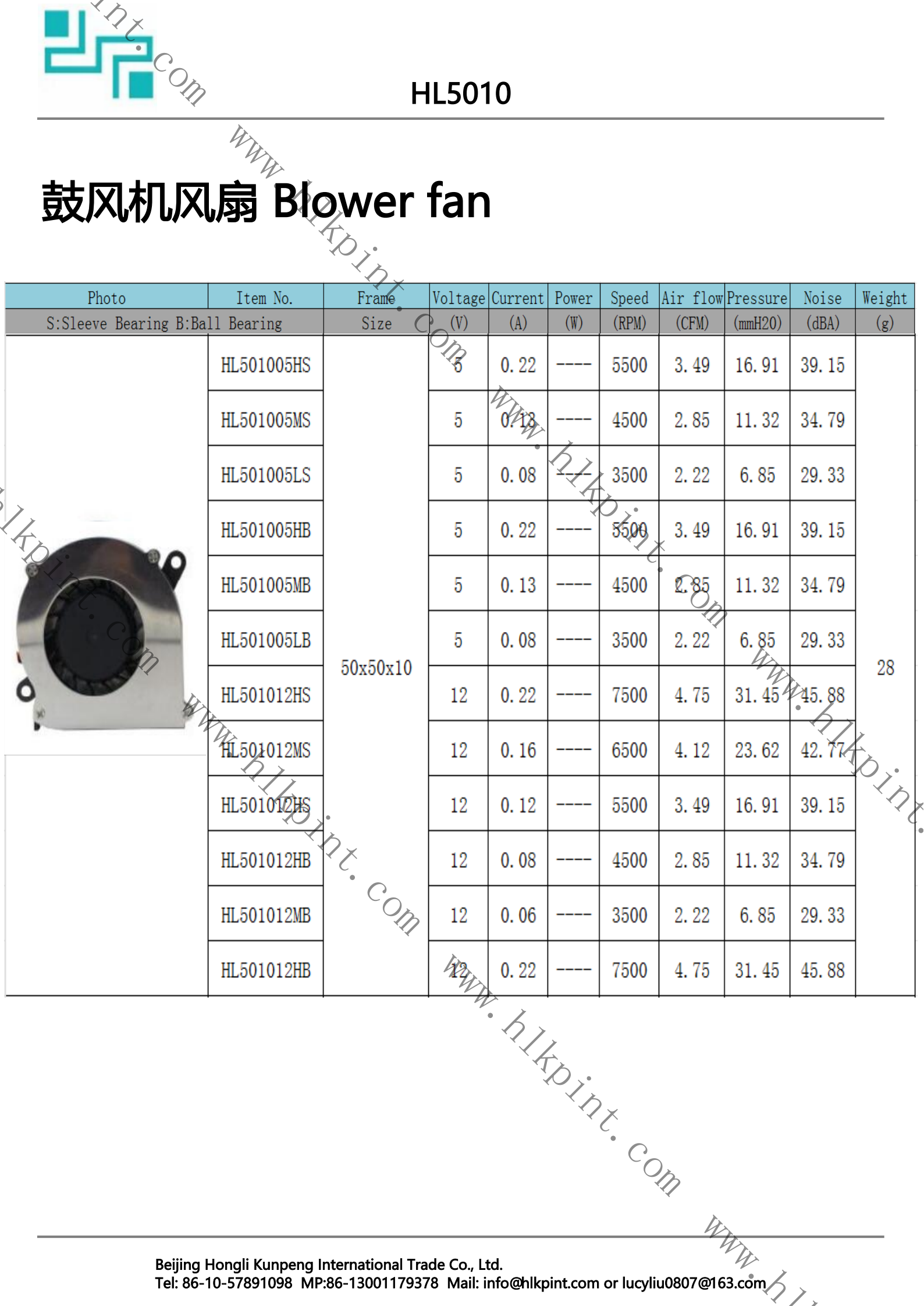 HL501005LB HL501005LB Blower Fan 50X50X10 5 0.08 3500 2.22 6.85 29.33 28