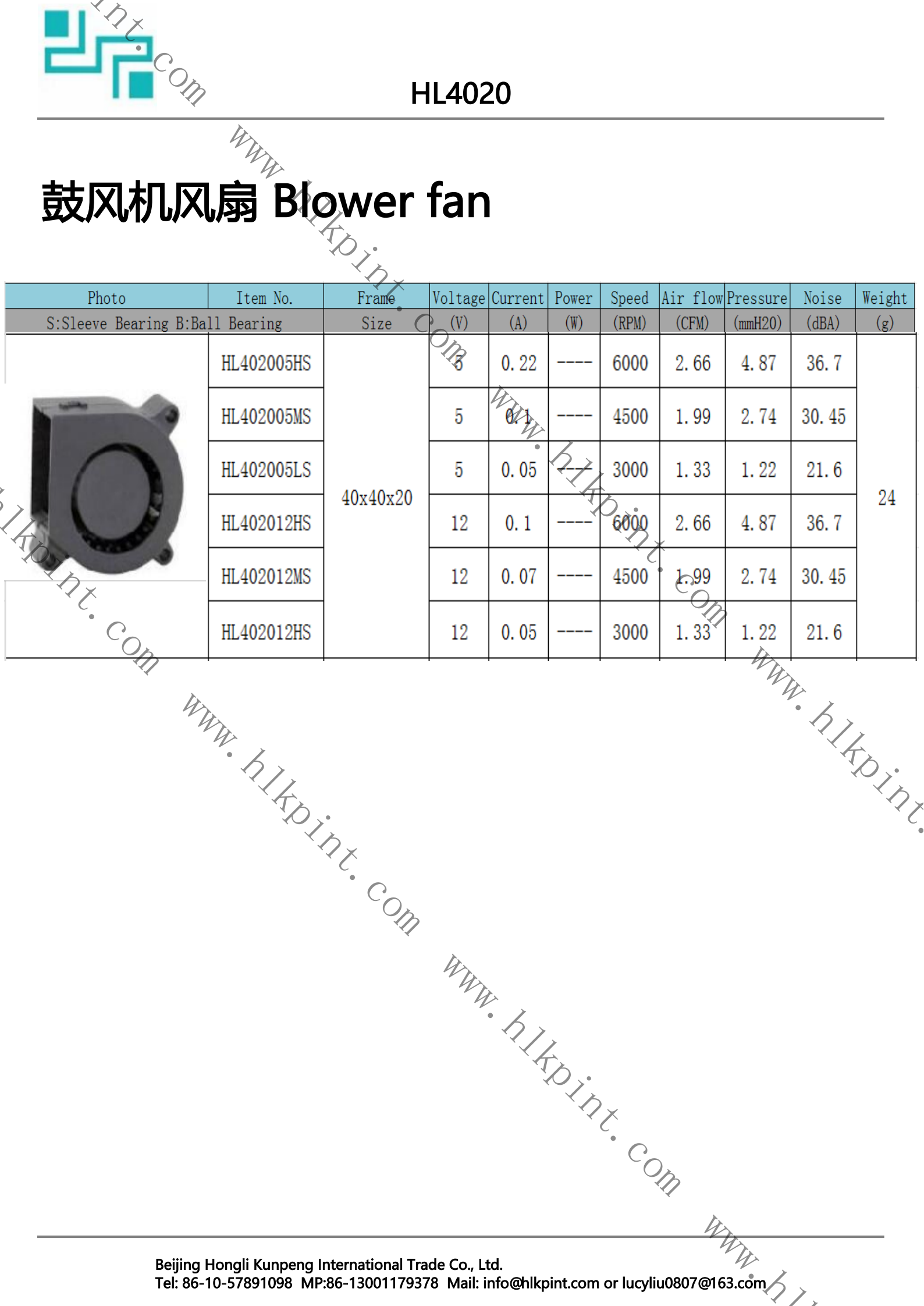 HL402005LS HL402005LS Blower Fan 40X40X20 5 0.05 3000 1.33 1.22 21.6 24