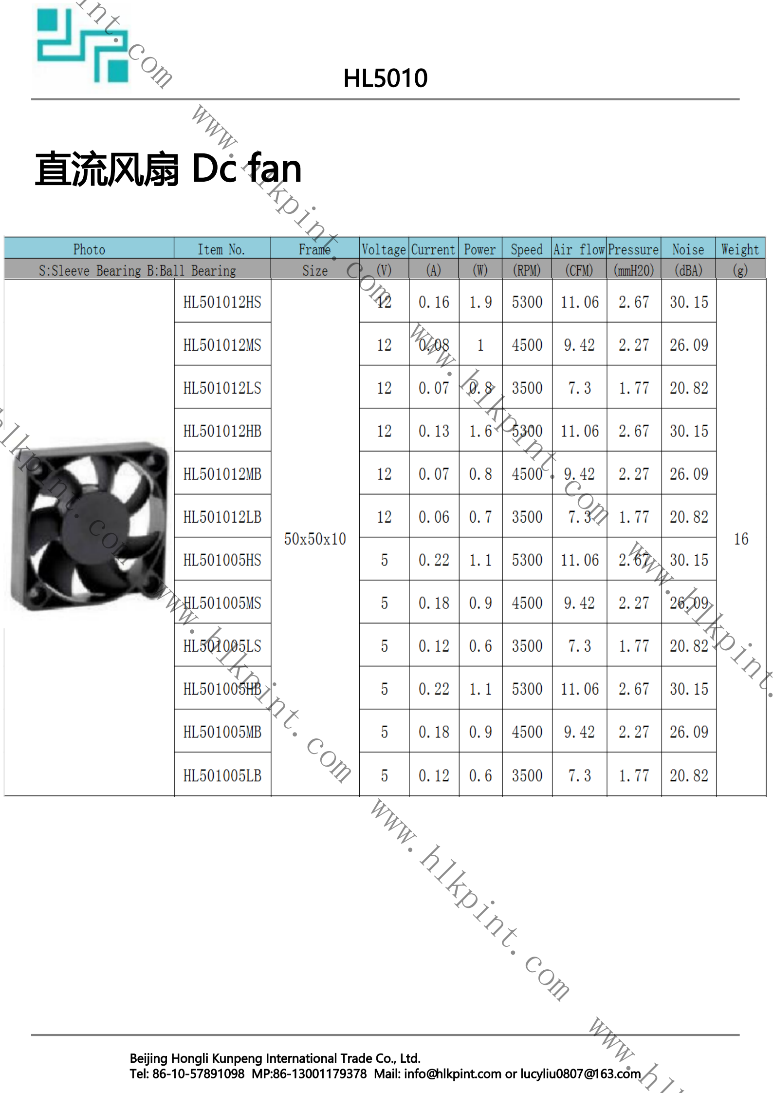HL501005LB HL501005LB Dc fan 50X50X10 5 0.12 0.6 3500 7.3 1.77 20.82 16