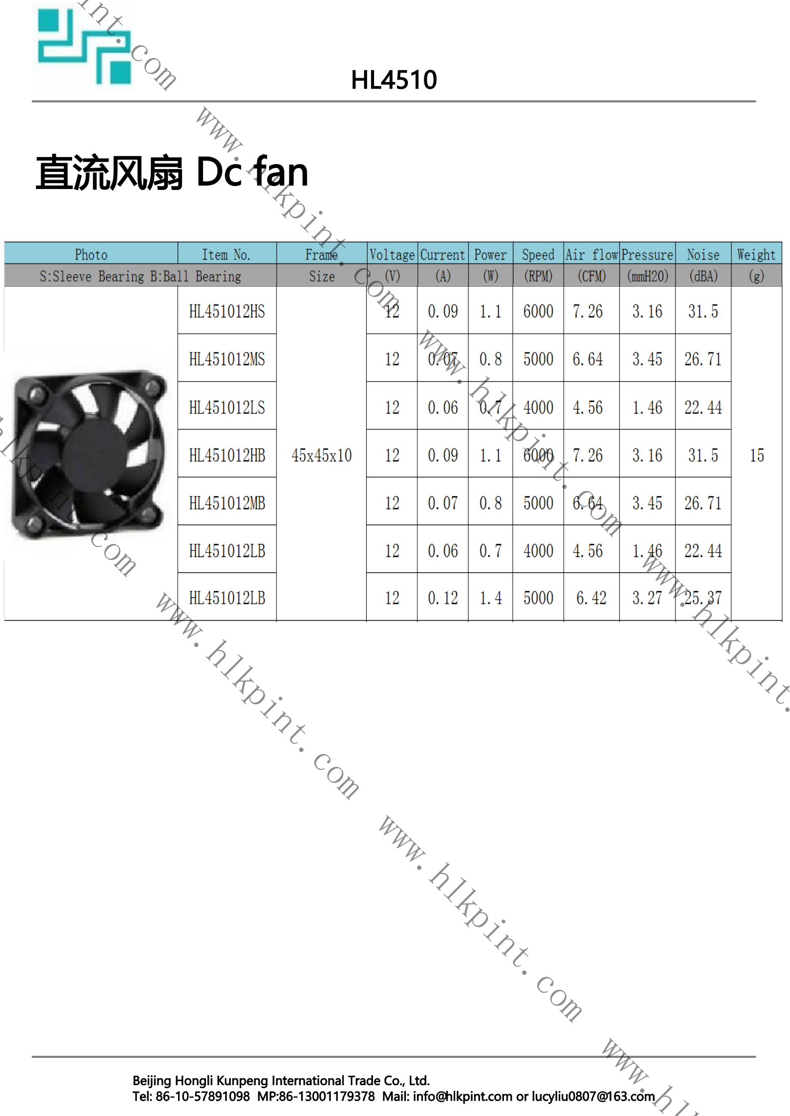 HL451012LB HL451012LB Dc fan 45X45X10 12 0.06 0.7 4000 4.56 1.46 22.44 15